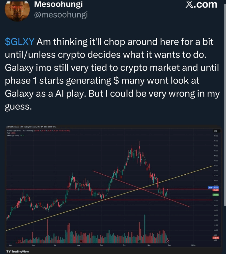 Galaxy Digital (GLXY) 股票昨日上涨约 3%,目前交易价格接近 26 美元。今年以来,该股累计上涨超过 45%,但上个月表现疲软。