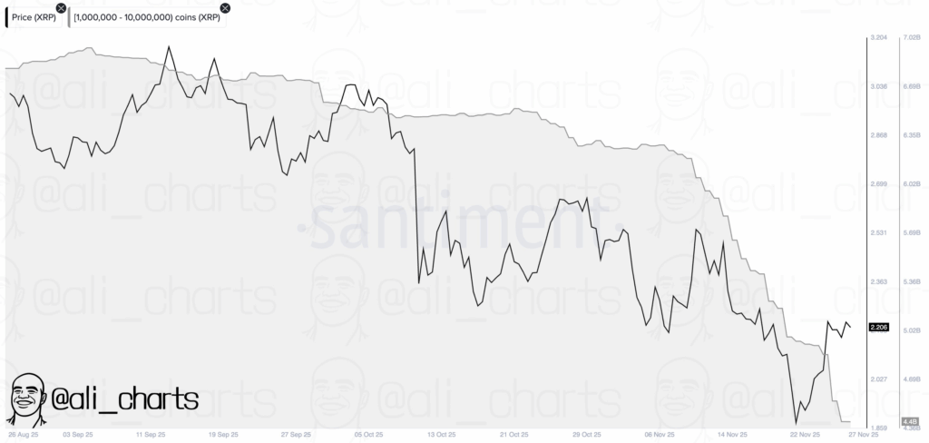 此外,XRP价格近期在2.2美元附近的盘整阶段也进一步反映了来自大型交易者或巨鲸的抛售压力。