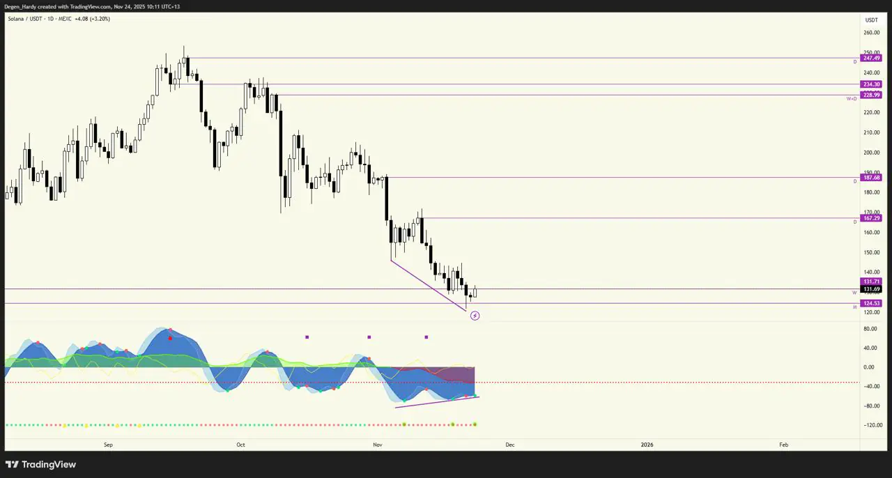 加密货币分析师Hardy指出,SOL已接近131美元至132美元附近的周线价值区域。该区域在之前的下跌中发挥了强劲支撑作用。下一个支撑位在124.53美元,这标志着下跌趋势的底部。如果波动持续,买家可能会在该区域进行防守。
