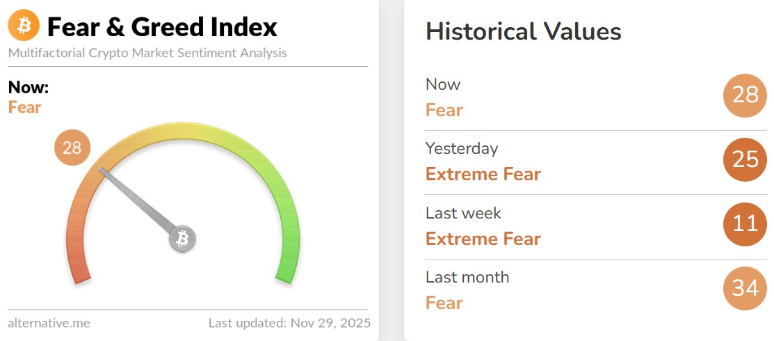 今日恐慌与贪婪指数为28(恐慌),较昨日的极度恐慌有所改善。随着抛售压力缓解和市场波动降温,市场情绪略有回升。与上周极低的11相比,市场信心正在恢复,但仍低于上月的34,表明市场状况谨慎但正在改善。
