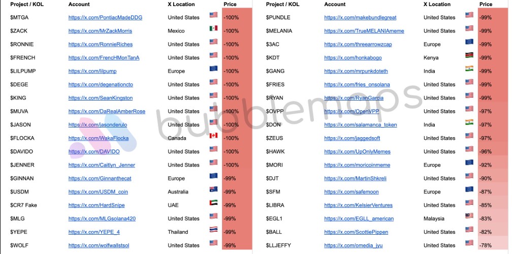 数据显示,超过 50% 的这些项目与 X 平台上的美国账户相关联,这使得美国成为协同操纵 Solana 的主要来源地。欧洲位居第二,而印度在所有项目中仅占两个代币。