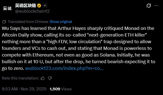 BitMEX联合创始人兼知名宏观经济评论员Arthur Hayes对MON——一个定位为与EVM兼容的高性能Layer-1区块链——提出了迄今为止最严厉的批评之一。Hayes在Altcoin Daily播客节目中表示,如果MON的“薄弱技术基础和糟糕的代币经济模型”问题得不到解决,其价格可能会“直接跌至零”。