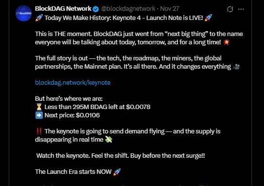 这些预测基于价格趋势、交易所确认、网络设计、总供应量以及今天早些时候发布的 Keynote 4 BlockDAG 所引发的兴奋情绪。