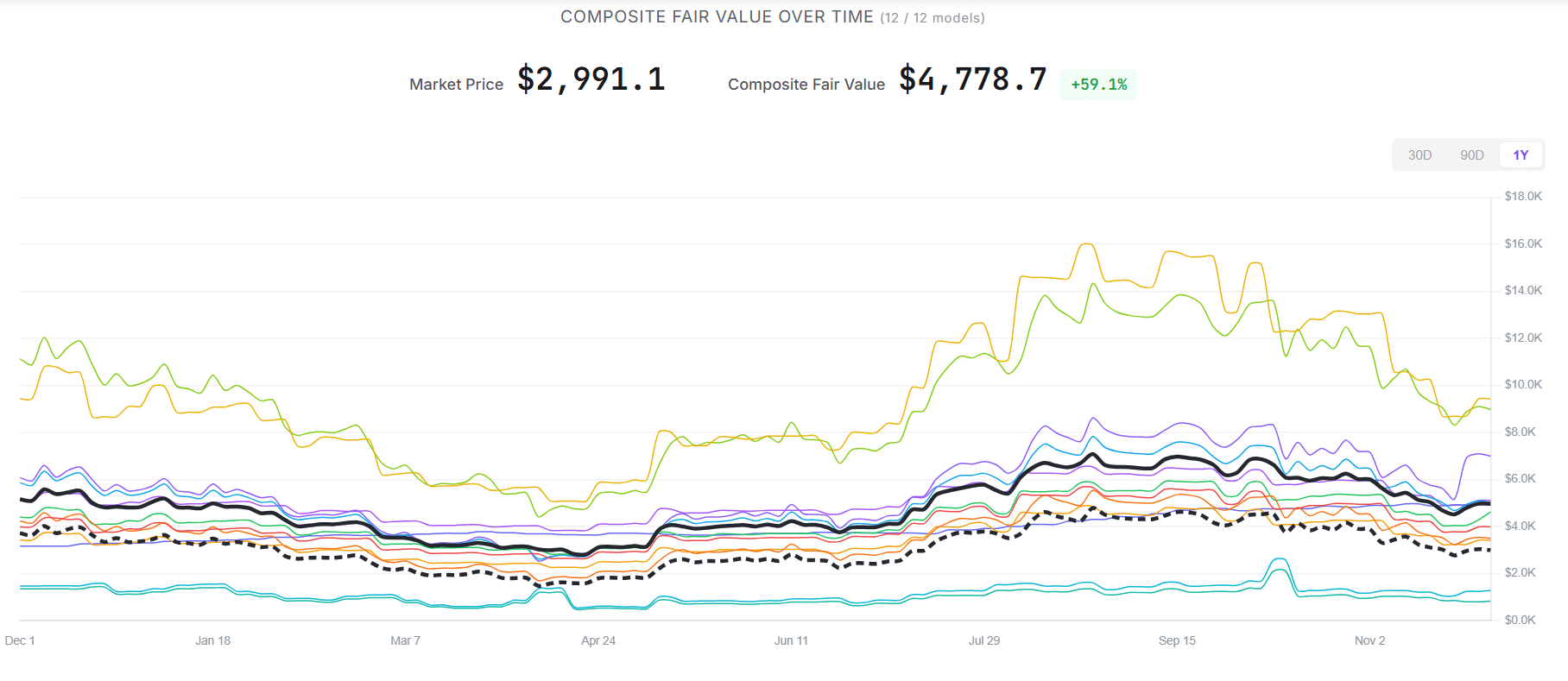 截至发稿时,基于12个模型得出的中位数(或综合公允价值)的平均目标价为4800美元。这表明ETH较其当前接近3000美元的价格水平被低估了59%。