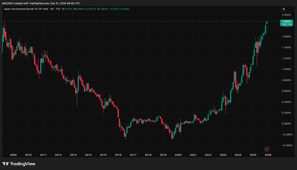 其基本机制不变。全球宏观基金和机构借入日元或做空日本国债,为收益更高的美元和欧元资产融资。随着日本国债收益率上升,日元融资环节的波动性更大,成本也更高。投资者会减少套利交易,并优先削减贝塔系数最高的资产,因此比特币在清算顺序中处于最前端。