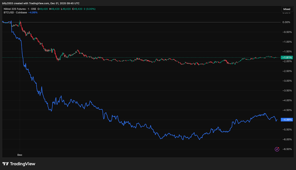 2024 年年中,日本央行出人意料地将利率上调至 0.25%,导致美元兑日元汇率急剧逆转,并促使比特币价格下跌近 30%,至约 4.9 万美元,原因是宏观资金纷纷抛售风险资产。今天也出现了类似的走势,比特币在亚洲交易时段跟随日经指数走低。