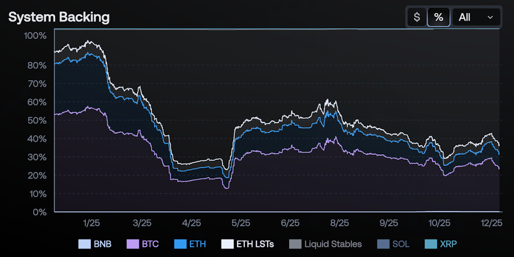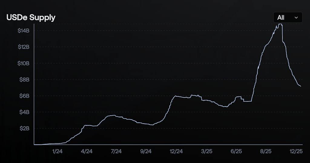今年10月11日的清算事件是加密货币历史上规模最大的一次。特朗普的一条关税推文导致比特币价格从约12万美元暴跌至约10.2万美元,并在24小时内抹去了约190亿美元的未平仓头寸。USDe在币安的交易价格一度跌至0.65美元,在Bybit的交易价格也跌至约0.92美元。尽管如此,以太坊仍然处理了19亿美元的赎回,维持了充足的资金储备,并控制了系统性风险蔓延。加上Bybit在2月份发生的15亿美元漏洞攻击事件,这是USDe第二次成功应对重大压力事件。然而,尽管USDe展现出了如此强大的韧性,其供应量仍从140亿美元的峰值下降了近50%,至约70亿美元。