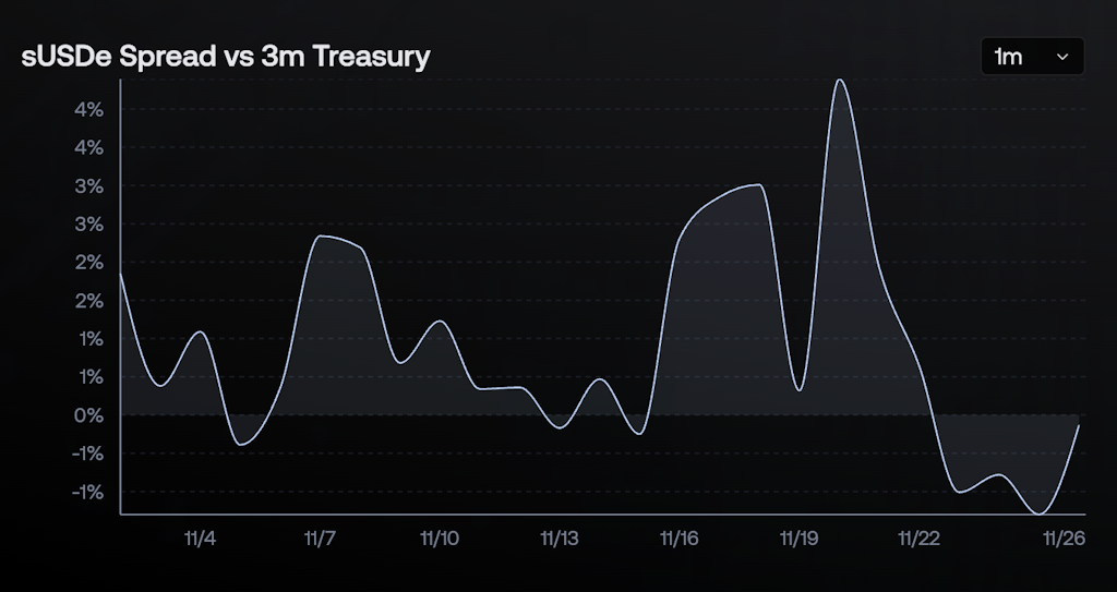 造成这种情况的根本原因是套期保值收益不佳。继10月份未平仓合约(OI)大幅减少后,比特币和以太坊的资金费率已降至负值甚至更低,Ethena的仪表盘显示主要加密货币的资金费率均为负值。自11月以来,sUSDe利差一直低于三个月期美国国债收益率。