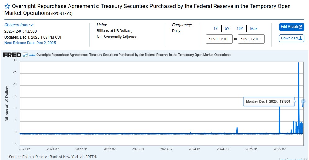 根据FRED数据,来自2020–2024仓库注入仍然在附近0 亿美元只有极少数情况下低于10亿美元。2025年则呈现出截然不同的景象。—多个仓库之间跳转30亿至100亿美元最终导致高达 290 亿至 300 亿美元的巨幅飙升.12 月 1 日的 135 亿美元注资是整个数据集中第二大的流动性注入。
