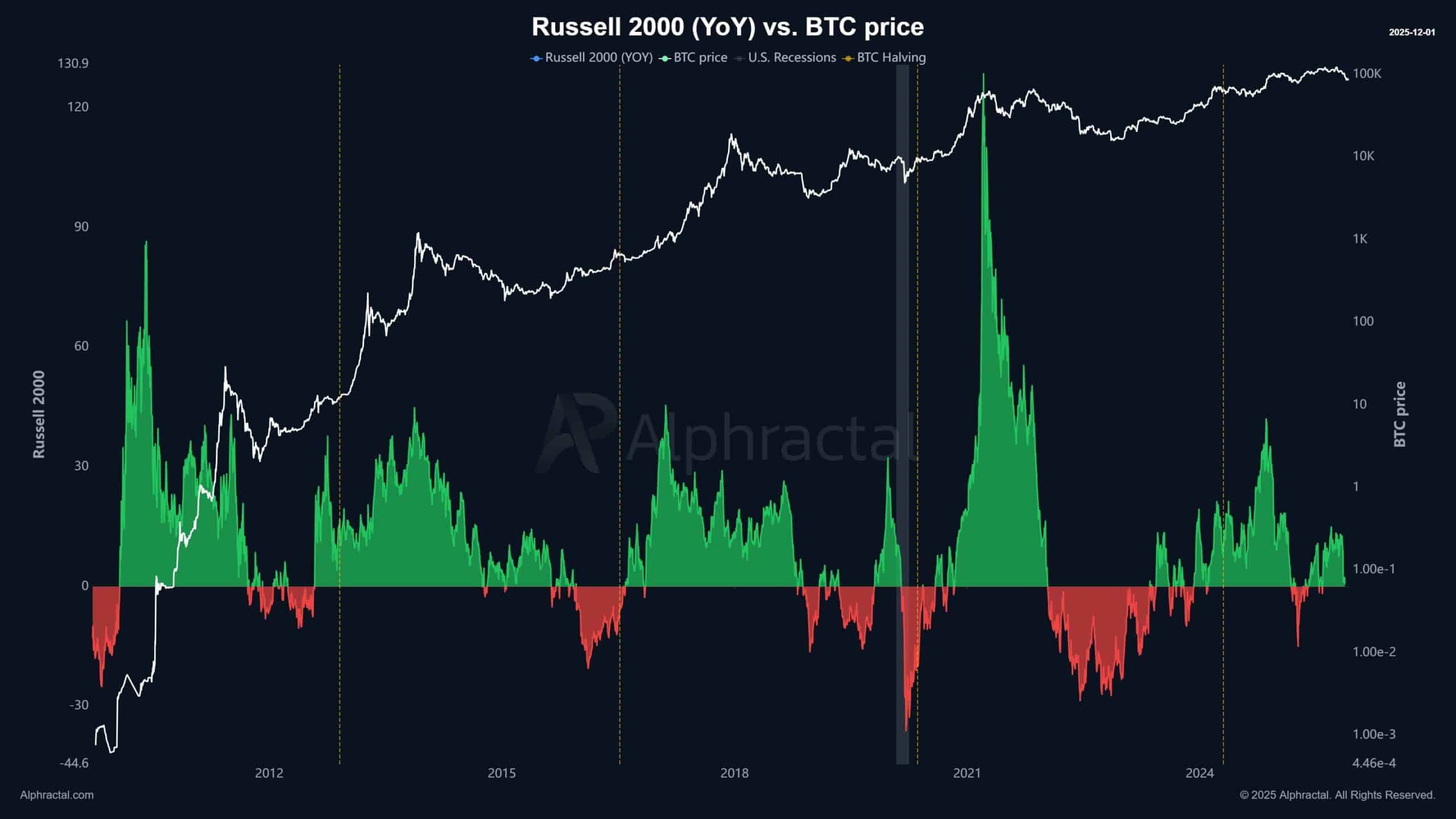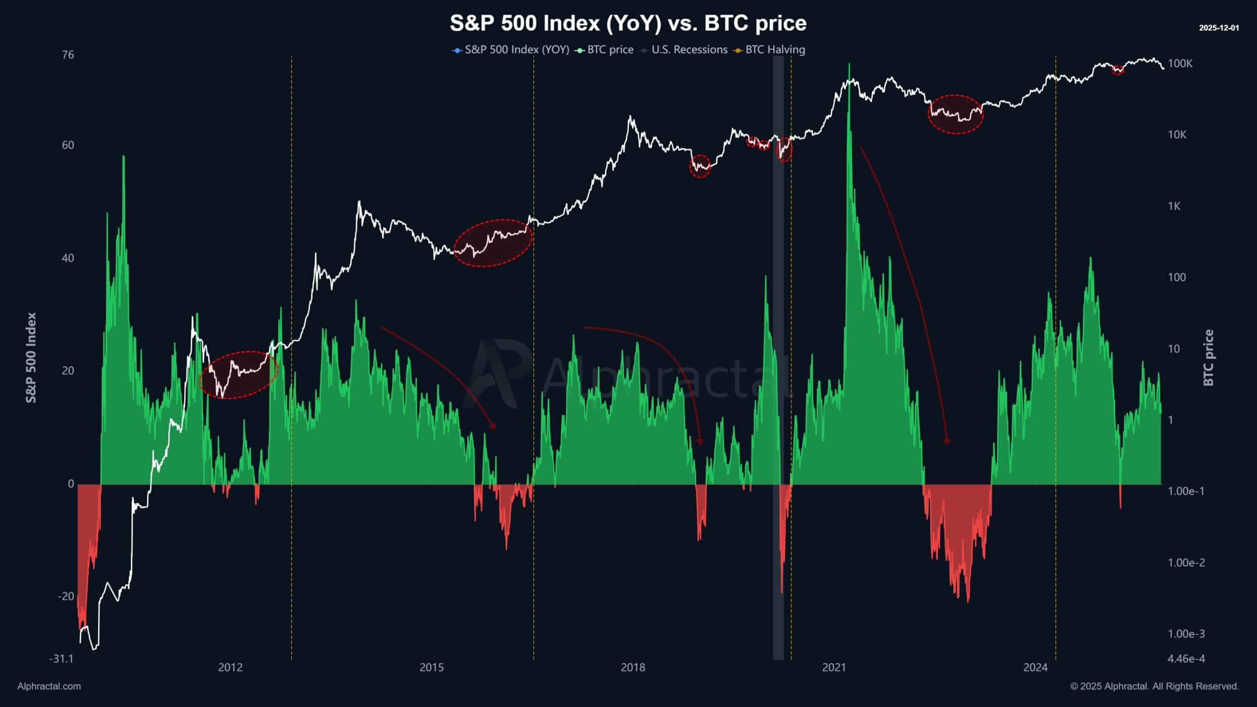 每当标普500指数的年度变化率跌入负值区间时,比特币已经发现它的周期底部。