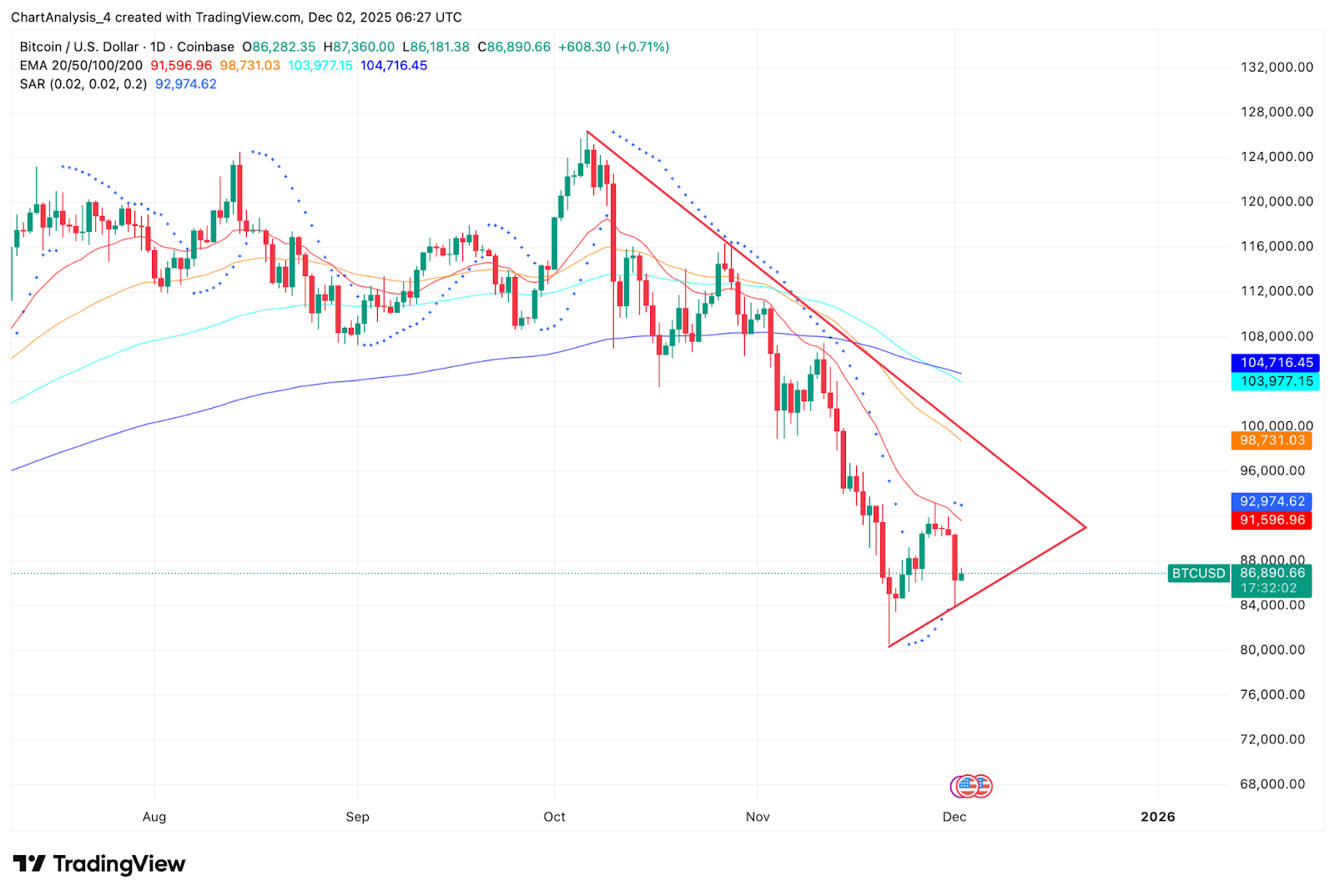 日线图显示,比特币在经历了三周的抛售并跌破多个支撑位后,目前处于下降楔形形态内波动。价格仍低于20日、50日、100日和200日均线,这些均线集中在91,500美元至103,900美元之间。这些均线的排列强化了整体下跌趋势,使得反弹尝试变得困难。