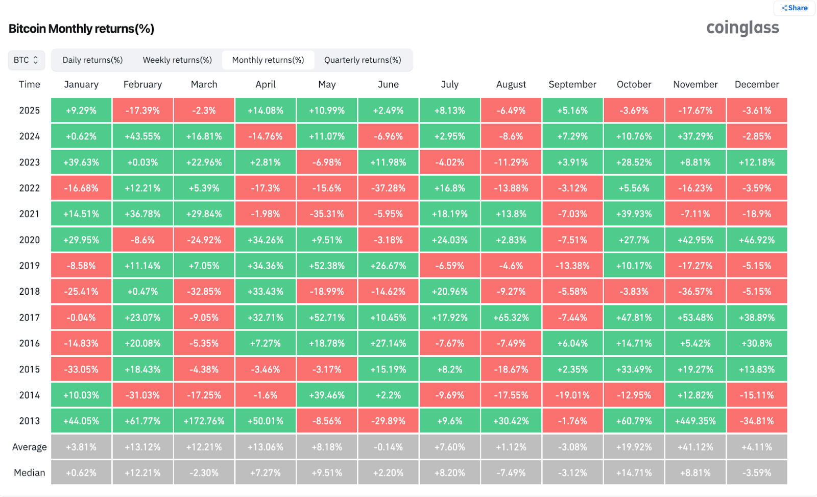 比特币的季节性因素提供了一个更为复杂的背景。根据 Coinglass 的数据,历史上,10 月和 11 月往往是比特币表现强劲的月份,10 月份的平均月涨幅为 19.92%,11 月份的平均月涨幅为 41.12%。