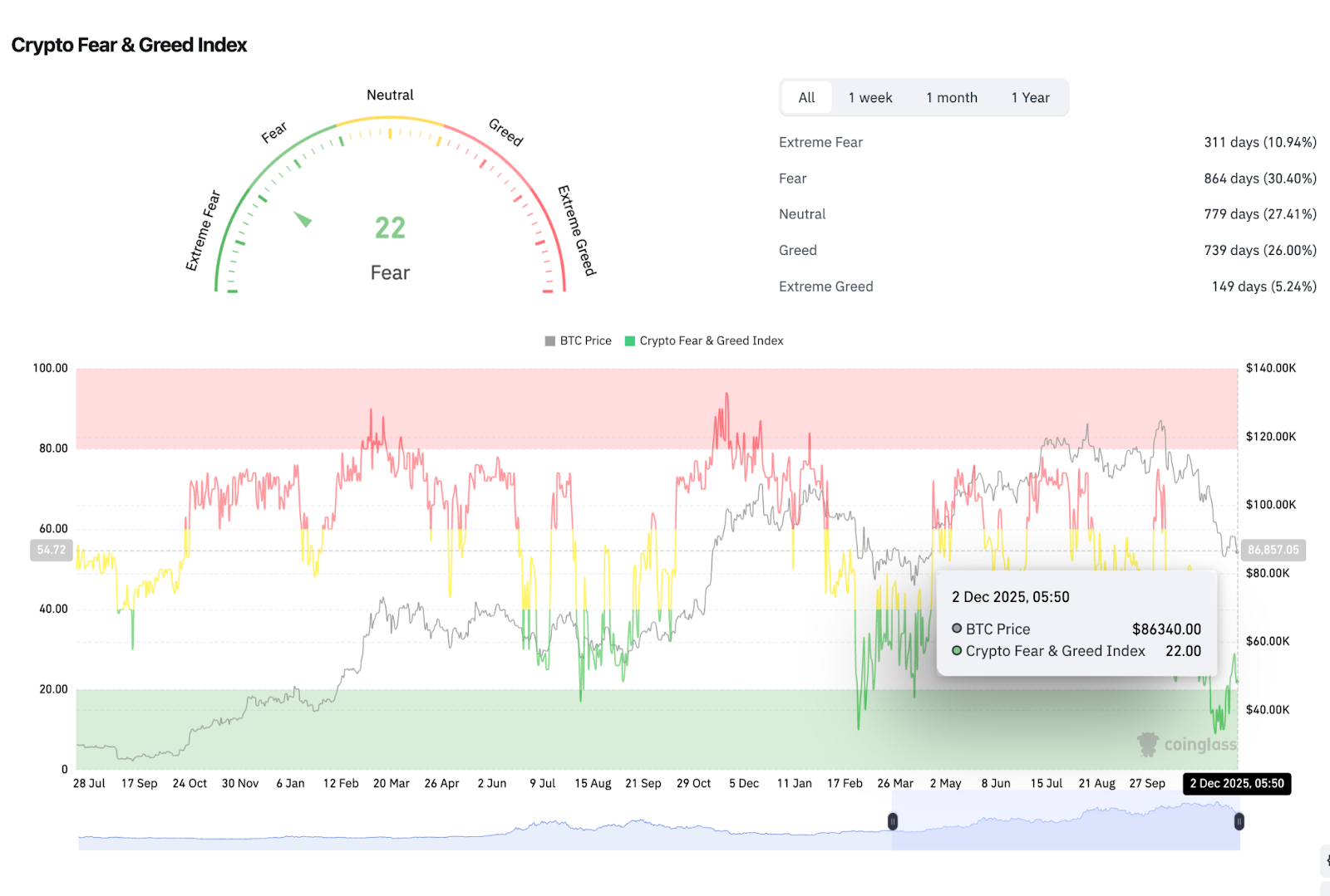 Coinglass数据显示,加密货币恐惧与贪婪指数为22,表明市场情绪极度恐慌。随着比特币价格在本季度初从11万美元以上回落,市场情绪迅速恶化。过去周期中类似的恐慌情绪通常伴随着反弹尝试,但并非每次都能带来持久的底部。