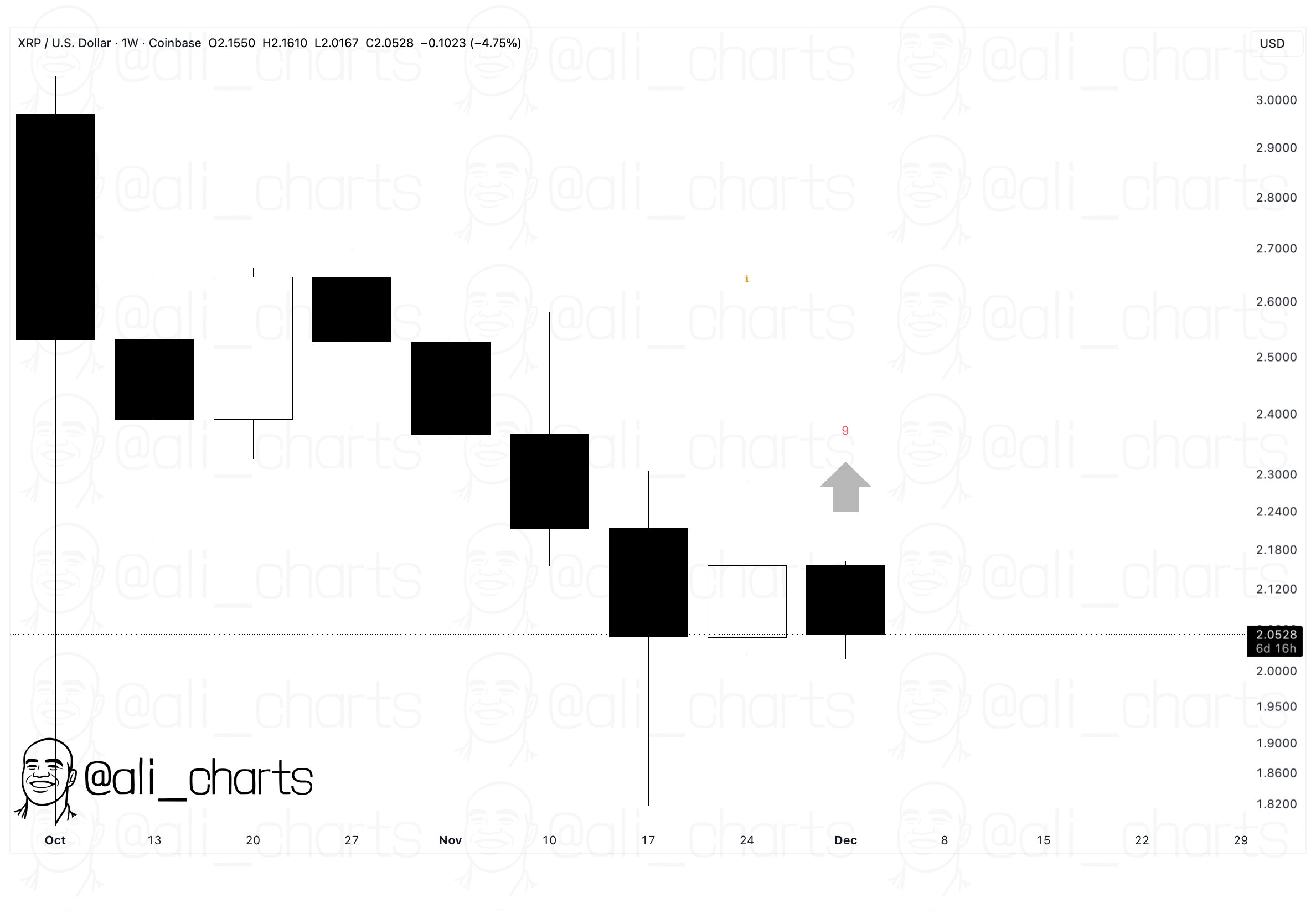 在一个新的邮政XRP分析师Ali Martinez在XRP周线图上谈到了TD Sequential信号。TD Sequential指的是来自技术分析(TA)这通常用于定位特定资产价格可能反转的点。