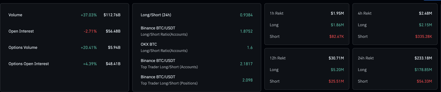 受宏观经济逆风影响,衍生品市场投资者信心不足。CoinGlass数据显示,比特币期货未平仓合约(OI)在过去24小时内下降2.17%至564.8亿美元,表明随着市场反弹预期减弱,交易员正在减少风险资金。