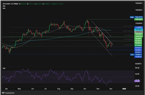 比特币价格在触及 126.2k 的历史高点后,进入下降通道,跌至 80.5k 的低点。随后,价格在下降通道上轨 93k 处受阻反弹,回落至 84k。尽管最终价格稳定在 85k 上方,但仍低于 74.4k 低点和 126.2k 高点的 78.6% 斐波那契回撤位。目前,相对强弱指数 (RSI) 低于 50。