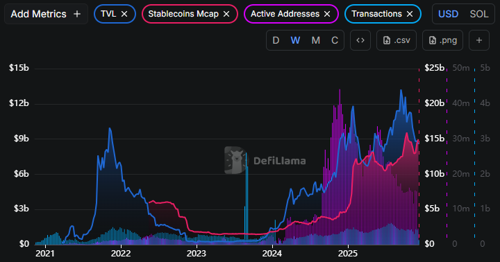 尽管SOL价格有所回落,但Solana加密货币的基本面依然稳固,并未到令人担忧的地步。根据……DefiLlama的根据 Solana 的每周图表数据,Solana 的总锁定价值 (TVL) 为 85.6 亿美元,虽然低于其 132.2 亿美元的历史最高水平,但相对于市场状况而言仍然强劲。