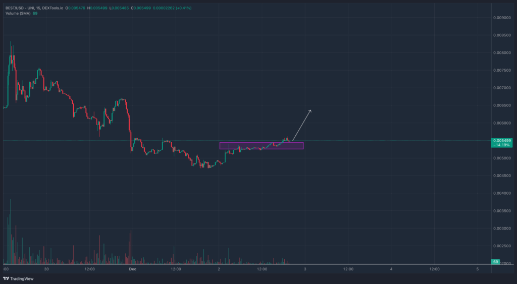 BEST 股票一经上市便出现混乱,正如所有新上市股票一样。开盘后价格飙升,随后早期卖家获利了结,股价大幅回落。最终,价格稳定在 0.00510-0.00515 区间,买家涌入并守住了该区域。之后,BEST 股价反弹至 0.00530 附近,这基本上是其图表上的第一个真正支撑位。