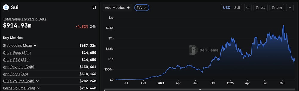 除了价格因素外,Sui的基本面也在不断增强。其高吞吐量和以对象为中心的设计持续吸引着开发者的关注,目前总锁定价值已接近10亿美元。