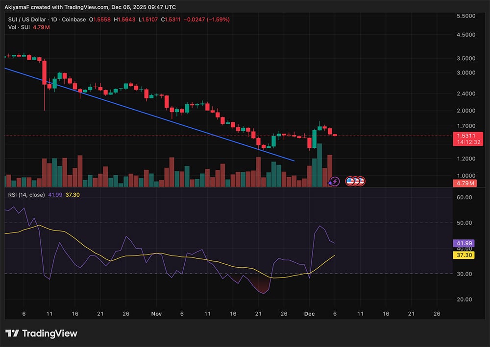 目前的图表看起来也不错。SUI在回落至支撑位附近后趋于稳定,随着成交量回升,看涨背离正在形成。阻力位仍然在2美元附近,但ETF相关交易的兴趣正在攀升至一个合理的水平。