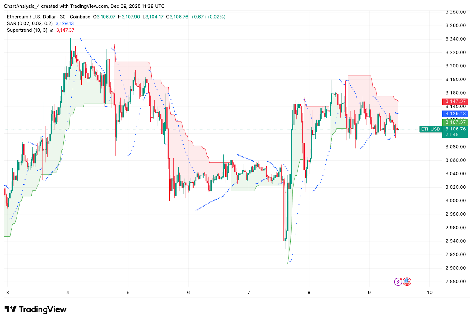 30分钟图表显示,以太坊价格在3147美元的超级趋势阻力位下方苦苦挣扎,多次未能建立起上涨动能。抛物线转向指标(Parabolic SAR)再次转为看跌,表明买方失去了短期控制权。这与突破前市场普遍存在的犹豫情绪相吻合。