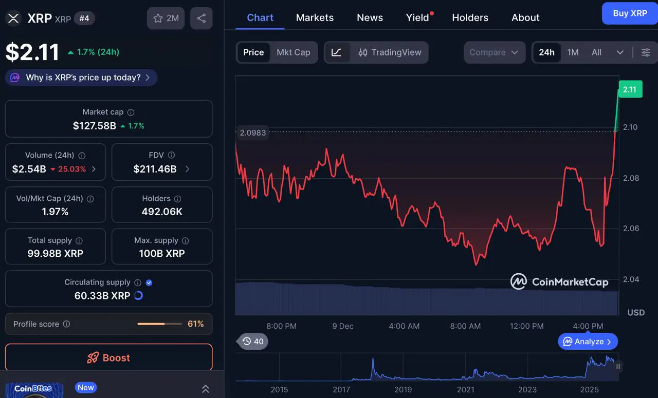 据报道,12月9日,XRP价格勉强维持在2.1美元的心理关口上方。CoinMarketCap.