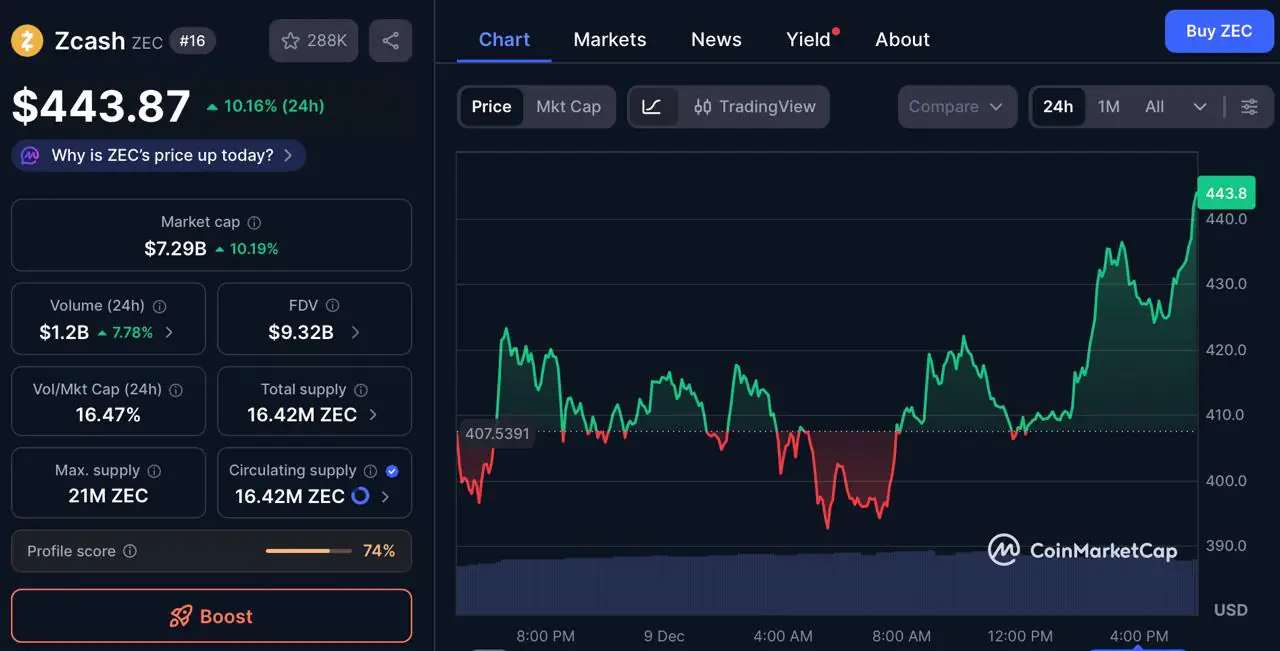 根据CoinMarketCap12 月 9 日,ZEC 的交易价格在 443.96 美元附近,24 小时内上涨超过 10%。