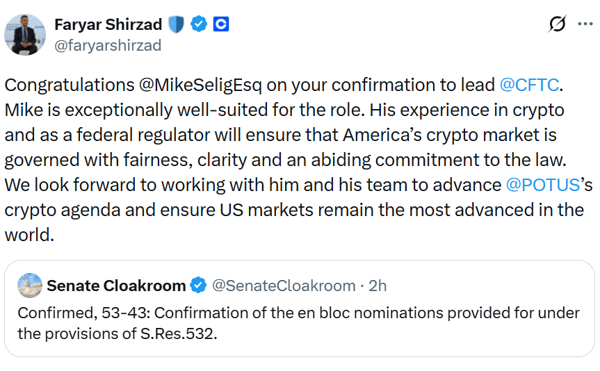 加密货币交易所 Coinbase 的首席政策官 Faryar Shirzad 在一篇 X 帖子中表示,Selig 的“加密货币经验以及作为联邦监管机构的经验将确保美国的加密货币市场得到公平、清晰和对法律的坚定承诺的管理”。