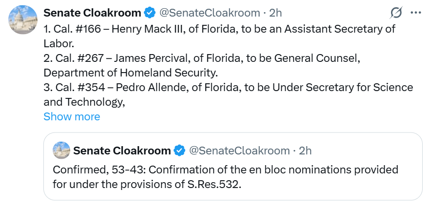 这两项任命是特朗普政府为政府各部门挑选的近 100 名其他提名人选之一,该提名人选于周四在参议院以 53 比 43 的投票结果获得通过。