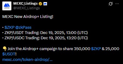 据官方消息来源称,zkPass Token 今天上市。2025年12月19日13:00 UTC,USDT和USDC将在Binance Alpha、MEXC、Kraken、LBank、KuCoin和Bybit等主要交易平台上线。USDT交易对将于13:00 UTC开始交易,USDC交易对将于13:20 UTC开始交易。