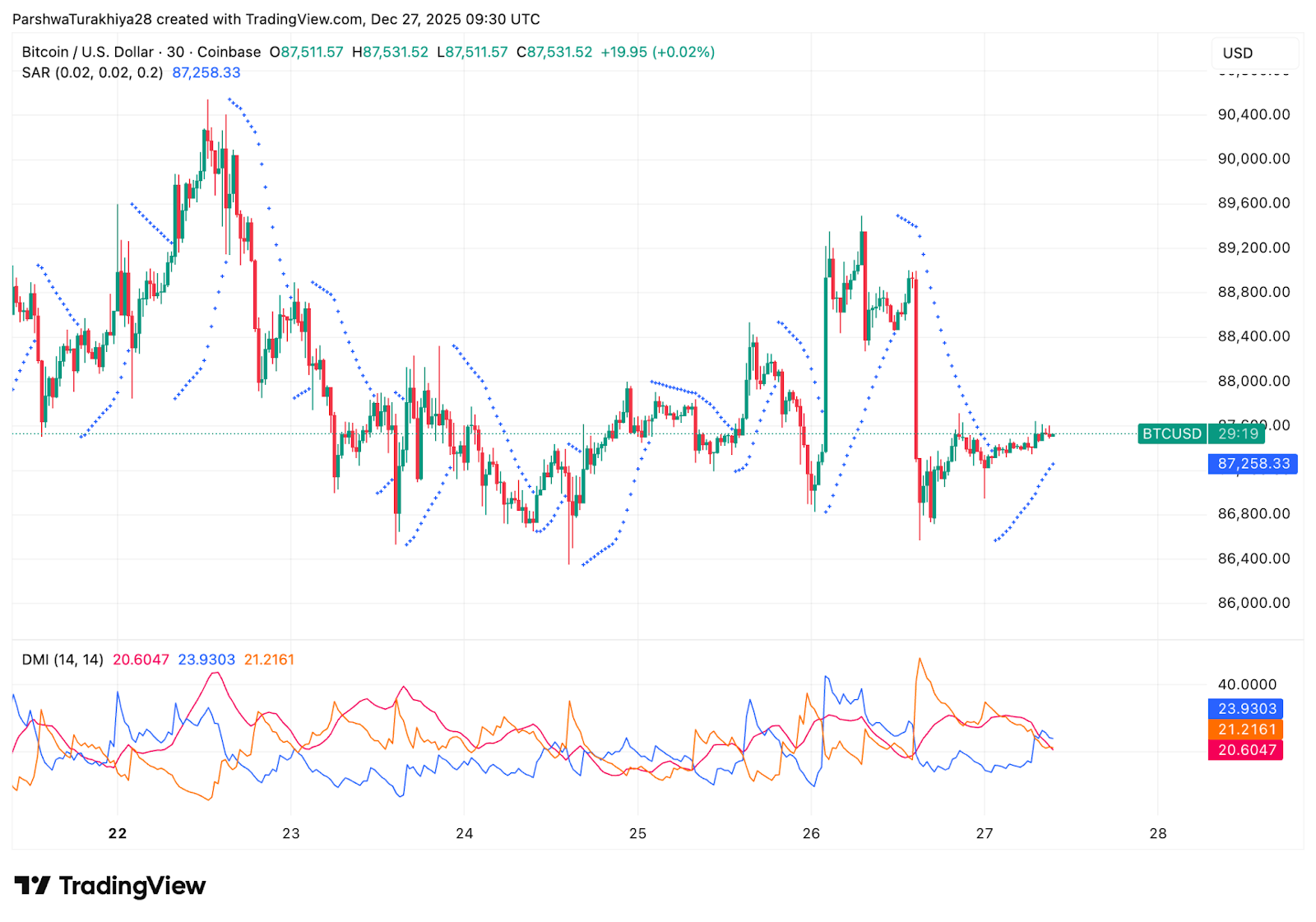 在30分钟图表上,比特币在本周早些时候反弹至89,500美元失败后,目前在87,000美元至88,000美元之间盘整。抛物线转向指标(Parabolic SAR)已略微转为支撑位,但动能依然疲弱。
