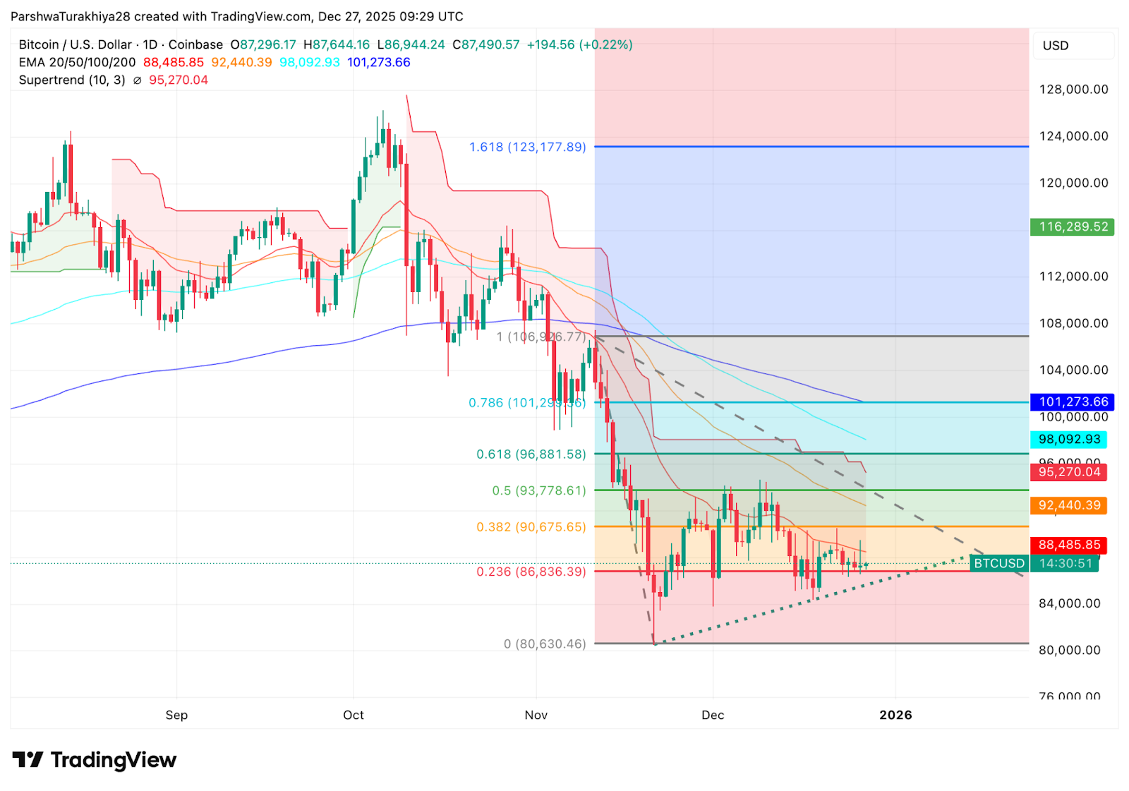 比特币价格今日在 87,500 美元附近交易,市场正在消化圣诞节期间的剧烈波动。这一周经历了闪崩恐慌、大量衍生品到期以及关键移动平均线下方持续的技术压力。尽管市场波动剧烈,但价格仍被困在狭窄的压缩区域内,买家在捍卫支撑位,但未能重新掌控趋势。