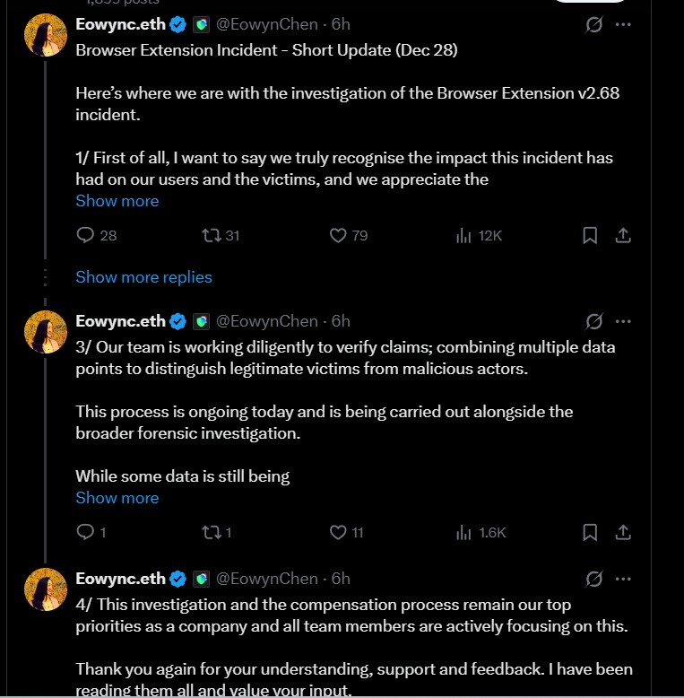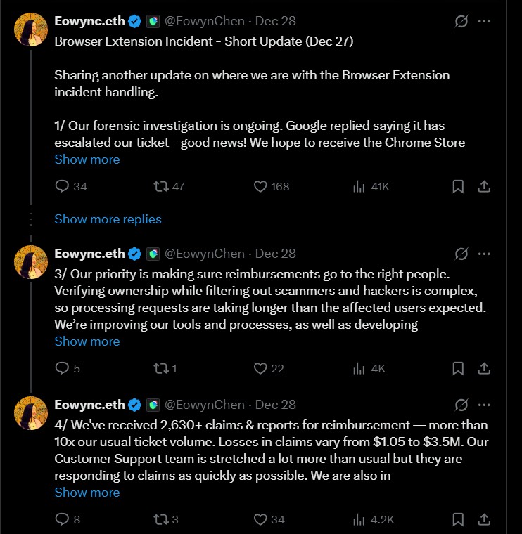 Trust Wallet 首席执行官 Eowyn Chen 发布了关于浏览器扩展程序 v2.68 供应链的最新更新。安全漏洞事件发生在 2025 年 12 月 24 日至 26 日期间。此次被泄露的更新导致用户钱包中超过 600 万美元被盗,使其成为当年最严重的钱包相关事件之一。