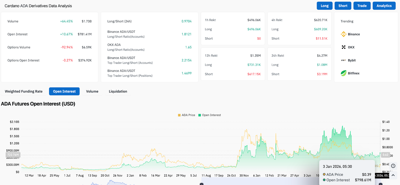 衍生品仓位的变动加剧了市场的紧张局势。ADA期货未平仓合约量已升至约7.98亿美元,当日涨幅超过10%。交易量飙升64%至17.3亿美元,表明尽管价格结构疲软,但市场参与度仍在上升。