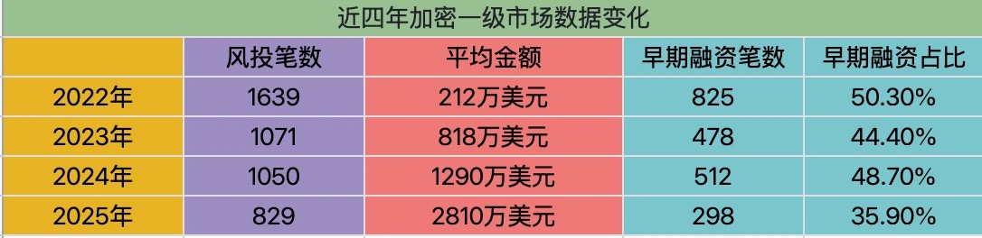 直接来数据,最近的一个四年周期内(2022 -2025),排除掉并购、IPO、公开募资等特殊一级市场活动,加密行业的融资笔数呈现出明显的下降态势(1639 ➡️ 1071 ➡️1050➡️829)。