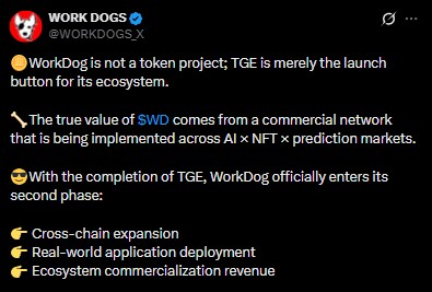 一旦WD TGE 日期窗口期结束后,该项目计划直接进入跨链扩张、实际部署和以盈利为导向的商业化阶段。由于代币生成活动 (TGE) 的时间线占据了 2026 年第一季度的大部分时间,分析师普遍预计 Work Dogs 代币的上市日期将在第二季度,第三季度则被视为次要选择。