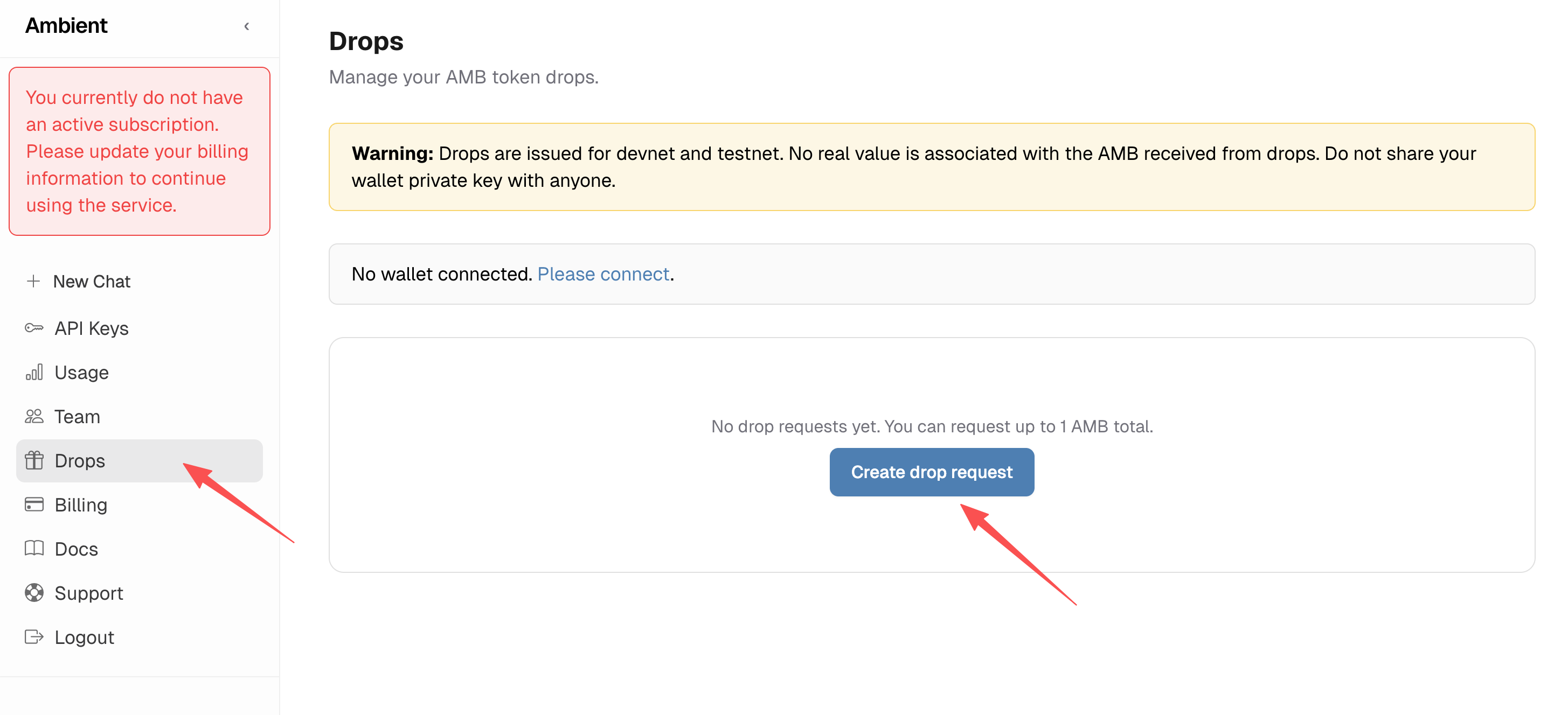STEP 4. 点击“Drops”并选择“Create drop request”,输入“1”后点击“Submit Request”。