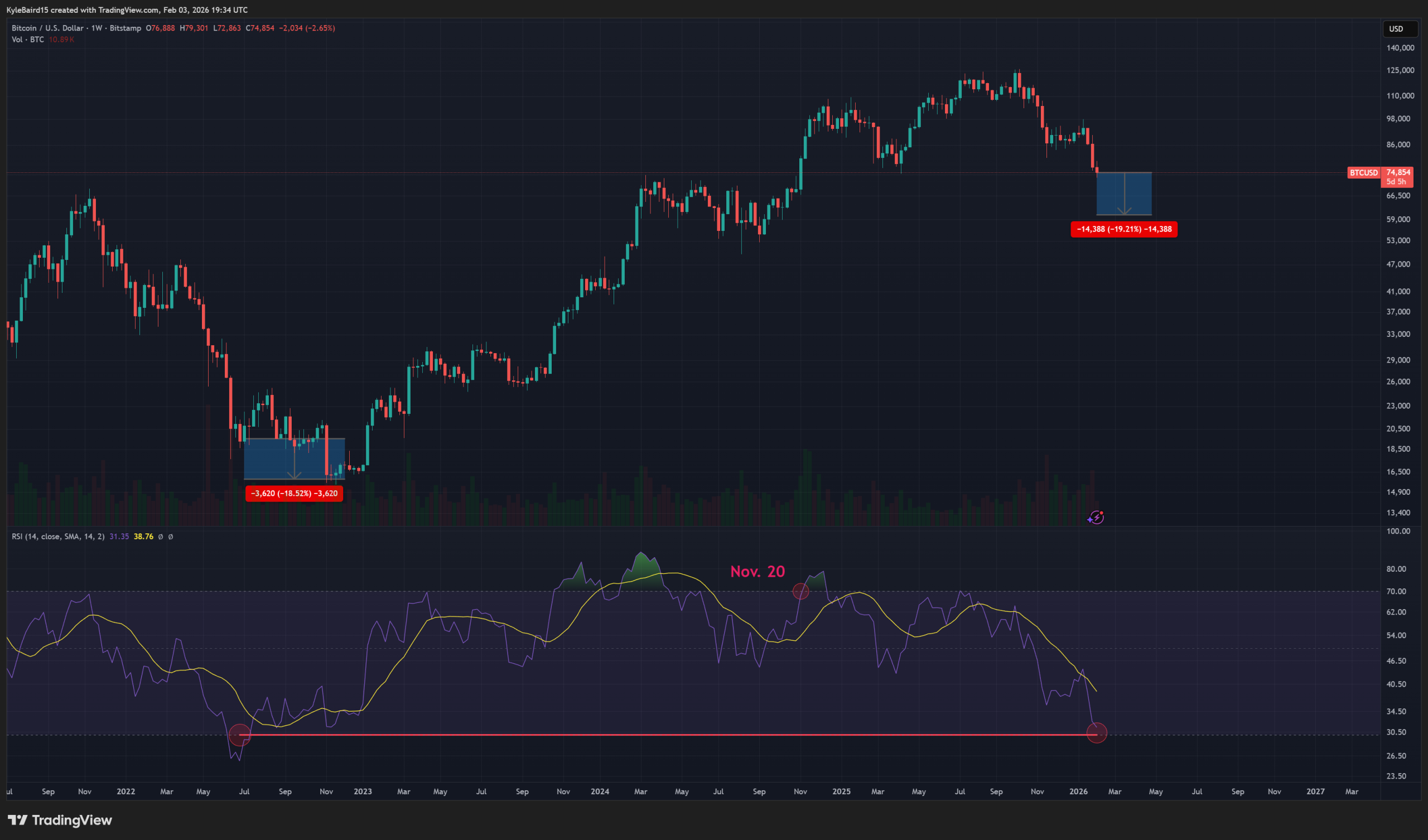 比特币相对强弱指数(RSI)——一种衡量近期价格波动速度和幅度的动量指标——目前徘徊在超卖水平 30 附近。上一次 RSI 如此之低是在 2022 年熊市底部附近,当时比特币价格随后又下跌了约 20%。如果今天出现类似的走势,则意味着比特币价格将跌至 6 万美元附近。