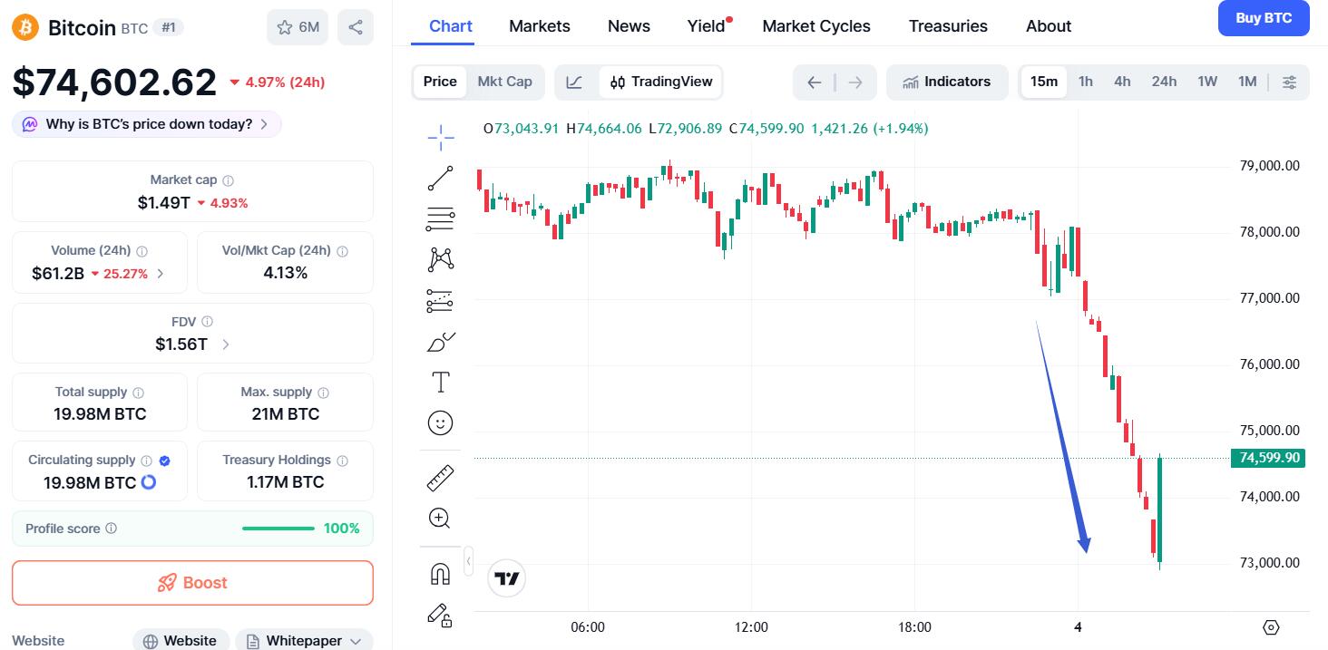 CoinMarketCap数据显示,2月3日周二美股午盘时段,加密货币普遍加速下跌。比特币一度跌破7.3万美元,较亚市早盘7.91万美元上方的日内高位跌超6000美元、跌近8%,刷新2024年11月上旬特朗普胜选后低位。